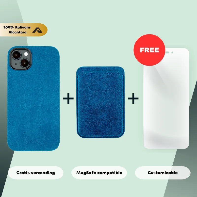 Alcantara bundel – iPhone 14 Plus – Alcantara Case + MagSafe Wallet + Gratis Screenprotector | Sapphire Blue