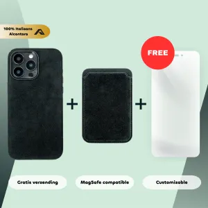 Alcantara bundel – iPhone 14 Pro Max – Alcantara Case + MagSafe Wallet + Gratis Screenprotector | Carbon Black