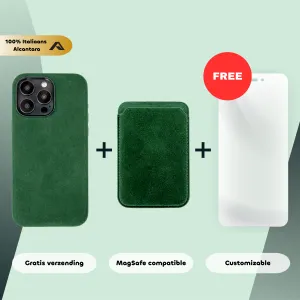 Alcantara bundel – iPhone 15 Pro Max – Alcantara Case + MagSafe Wallet + Gratis Screenprotector | Emerald Green