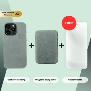 Alcantara bundel – iPhone 15 Pro Max – Alcantara Case + MagSafe Wallet + Gratis Screenprotector | Nardo Grey