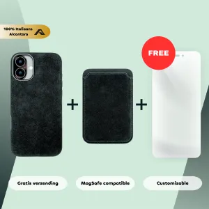 Alcantara bundel – iPhone 16 – Alcantara Case + MagSafe Wallet + Gratis Screenprotector | Carbon Black