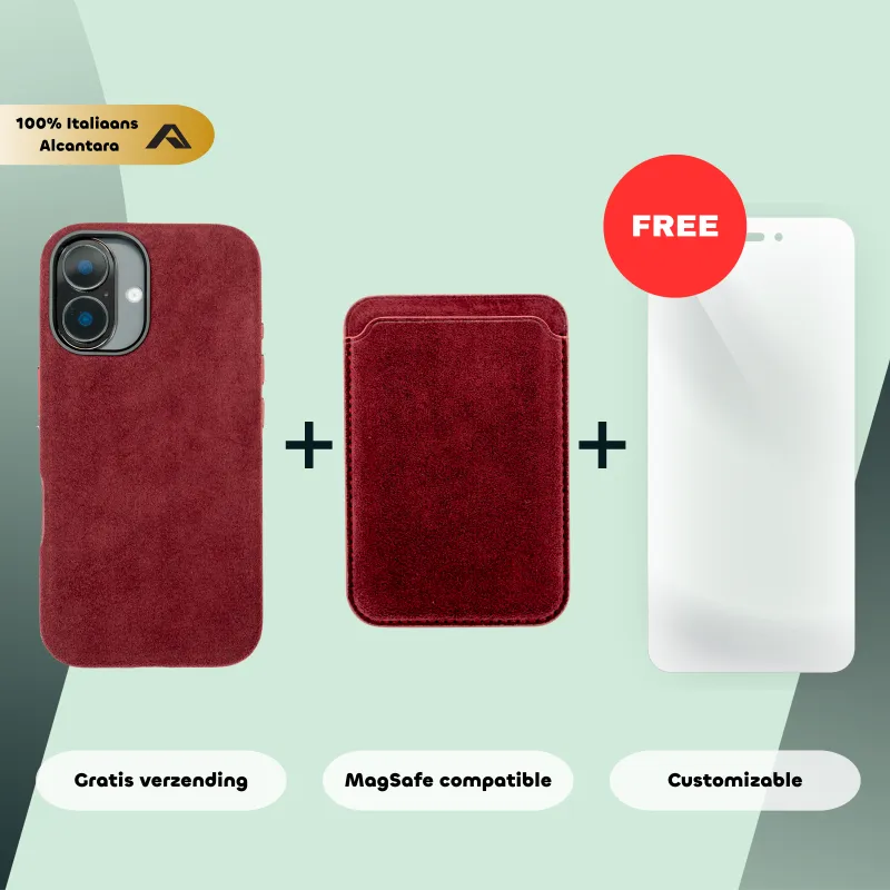Alcantara bundel – iPhone 16 Plus – Alcantara Case + MagSafe Wallet + Gratis Screenprotector | Ruby Red