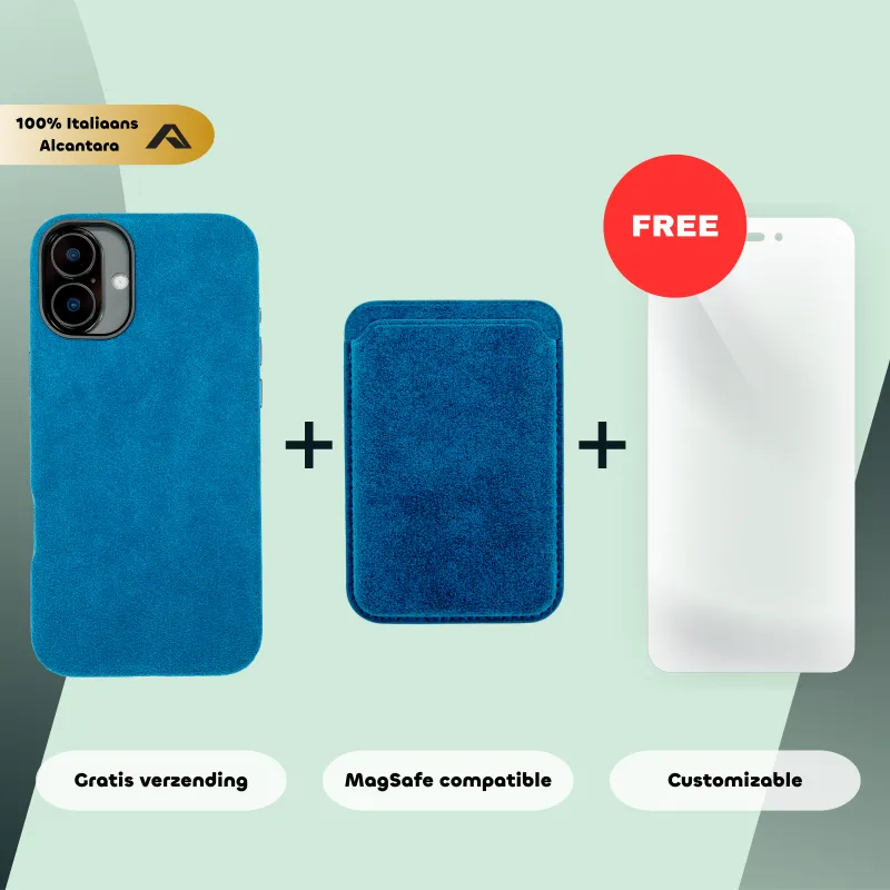 De pluspunten van onze Alcantara bundel – iPhone 16 Plus – Alcantara Case + MagSafe Wallet + Gratis Screenprotector | Sapphire Blue