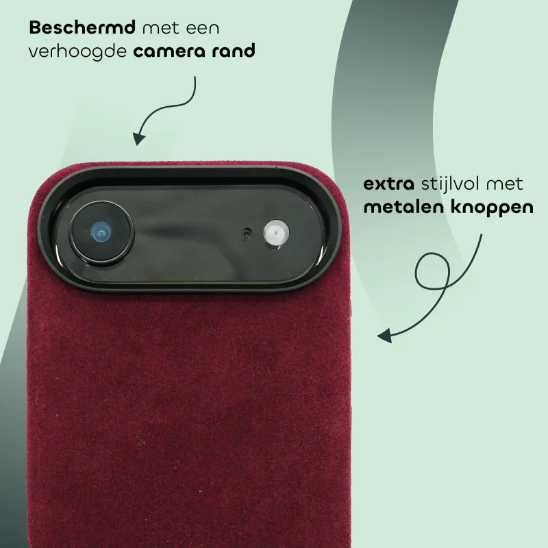 De case heeft opstaande randen rond het scherm en de cameralens, en het zachte Alcantara zorgt voor extra grip. Zo blijft je iPhone beschermd tegen krassen, valpartijen en dagelijks gebruik.